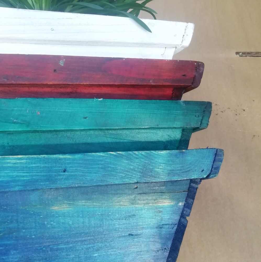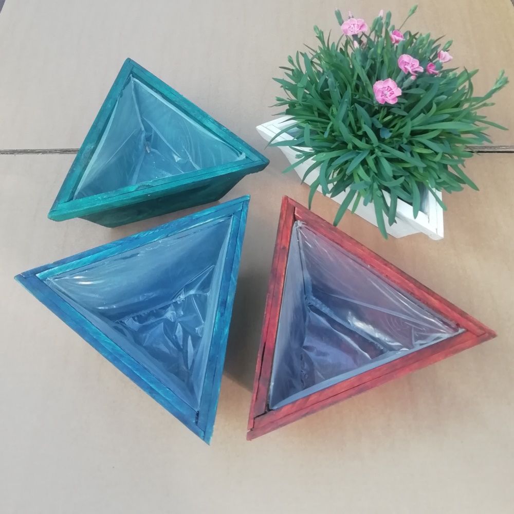 Kolmion muotoinen vaneriruukku.